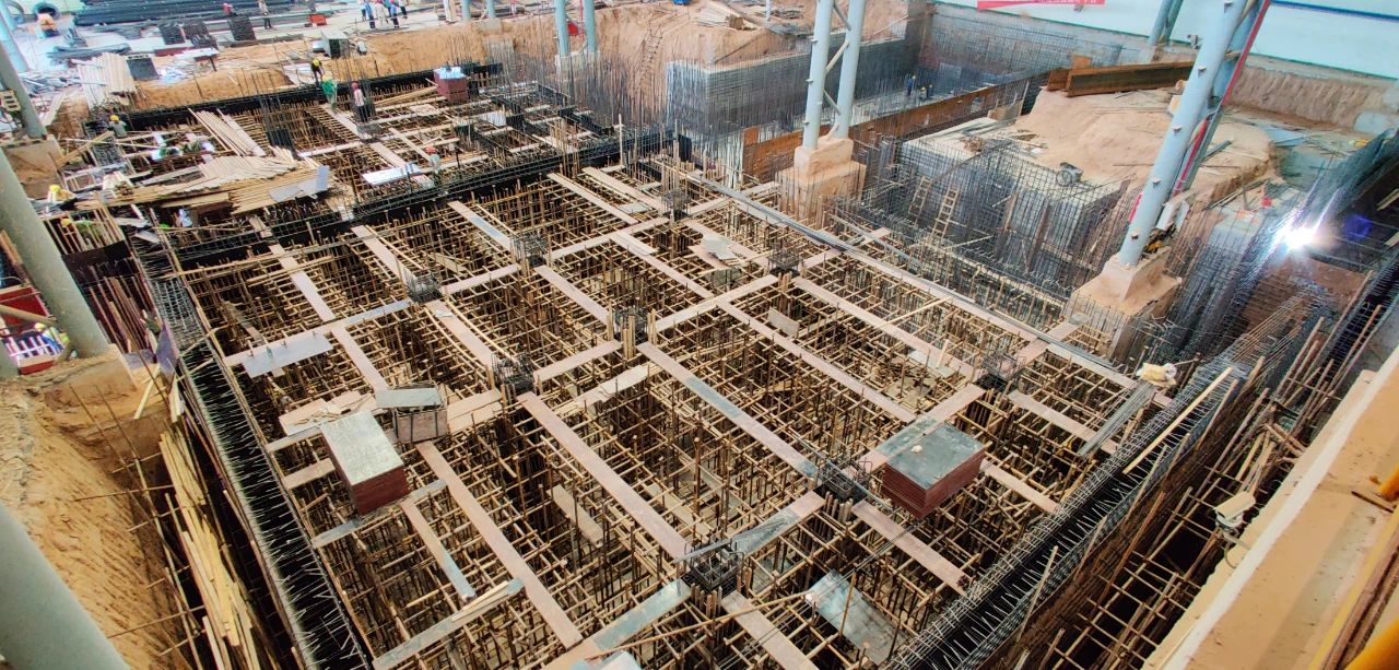 5月29日一大早,筆者來到豫聯(lián)集團下屬企業(yè)中孚高精鋁材公司第三臺冷軋機項目建設(shè)現(xiàn)場,看到近百名施工人員正在緊張有序地忙碌著,有的進行混凝土結(jié)構(gòu)鋼筋綁扎焊接,有的進行混凝土澆筑模板安裝加固,有的進行預(yù)埋鋼襯板焊接校正,電焊機、鋼筋彎曲機、模板切割機等設(shè)備運行的聲音此起彼伏,到處是一派爭分奪秒、加快建設(shè)的繁忙景象。