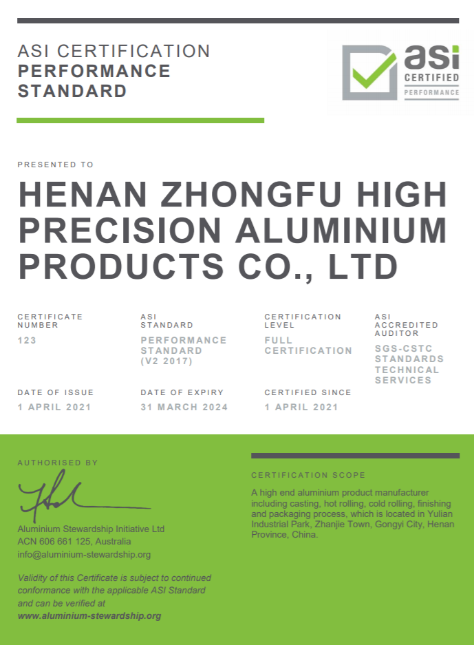 中孚高精鋁材公司通過鋁業(yè)管理倡議ASI績效標(biāo)準(zhǔn)認(rèn)證