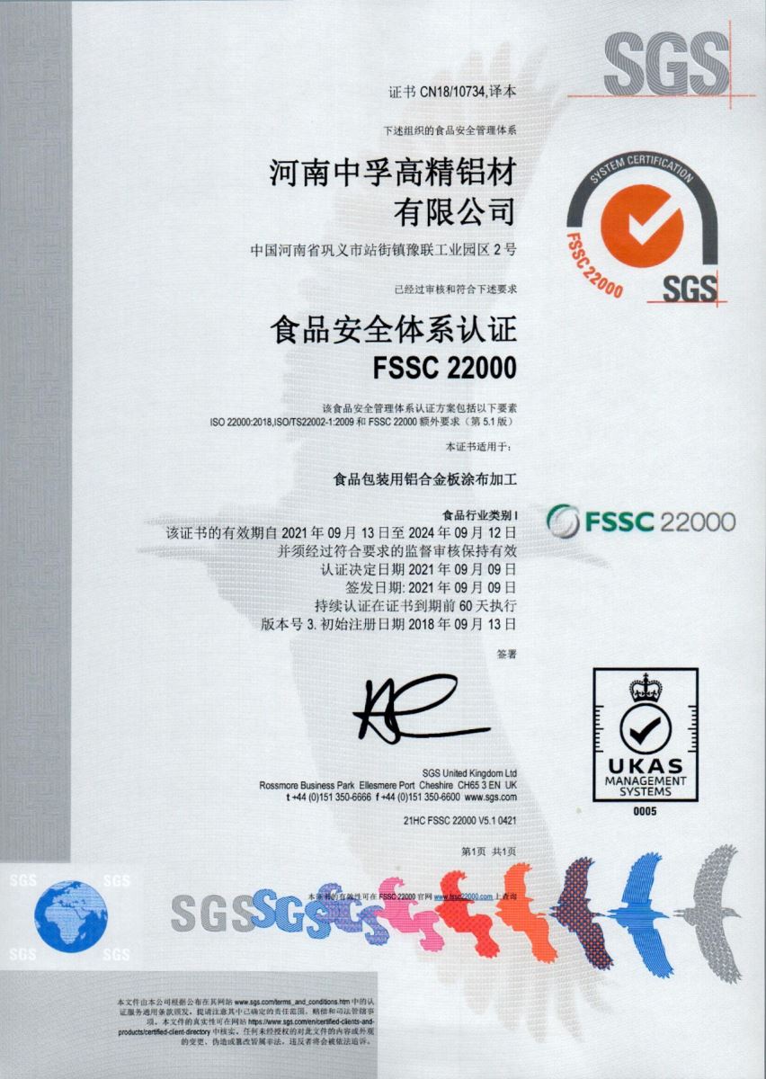 近日,中孚高精鋁材公司順利完成了FSSC22000食品安全管理體系第三方認(rèn)證換版工作,獲得了新證書。