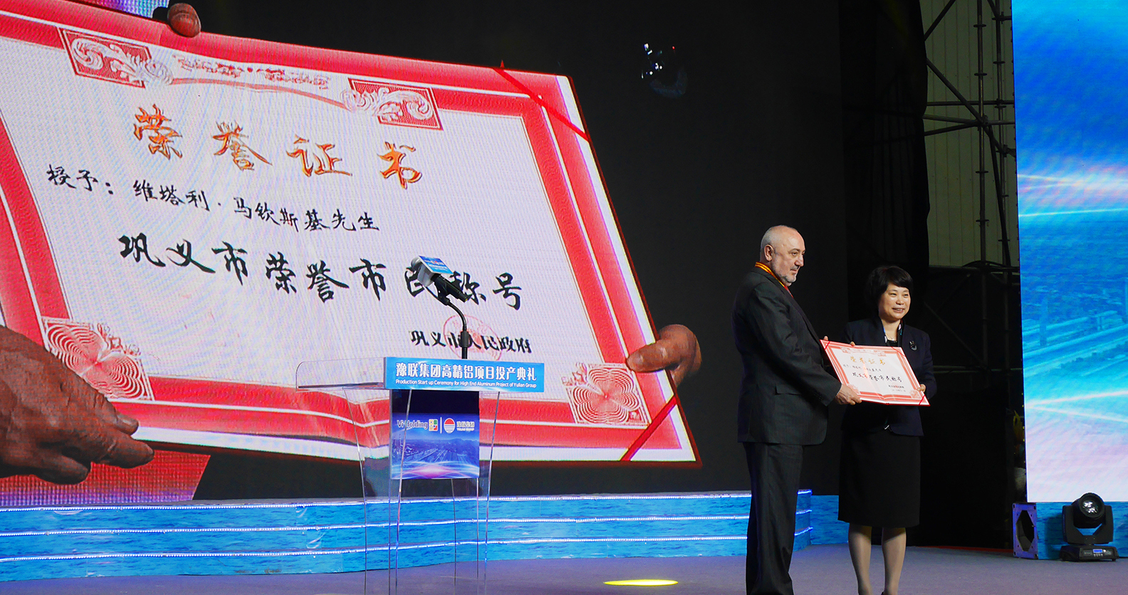 鞏義市市長孫淑芳向Vi Holding公司總裁維塔利•馬欽斯基先生頒發(fā)“鞏義市榮譽市民”證書
