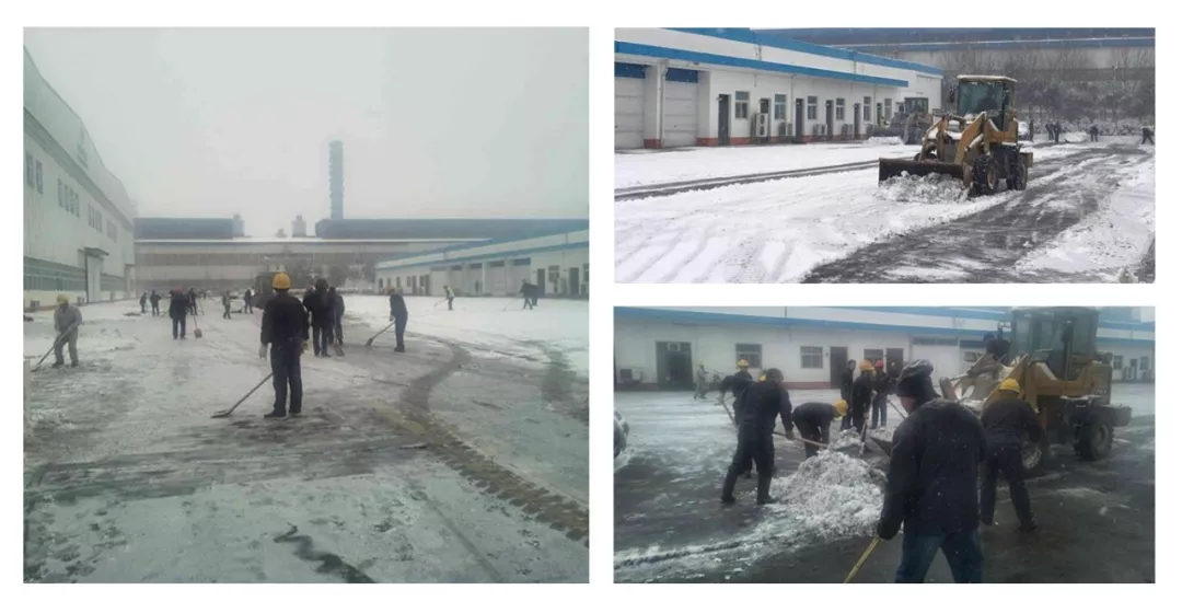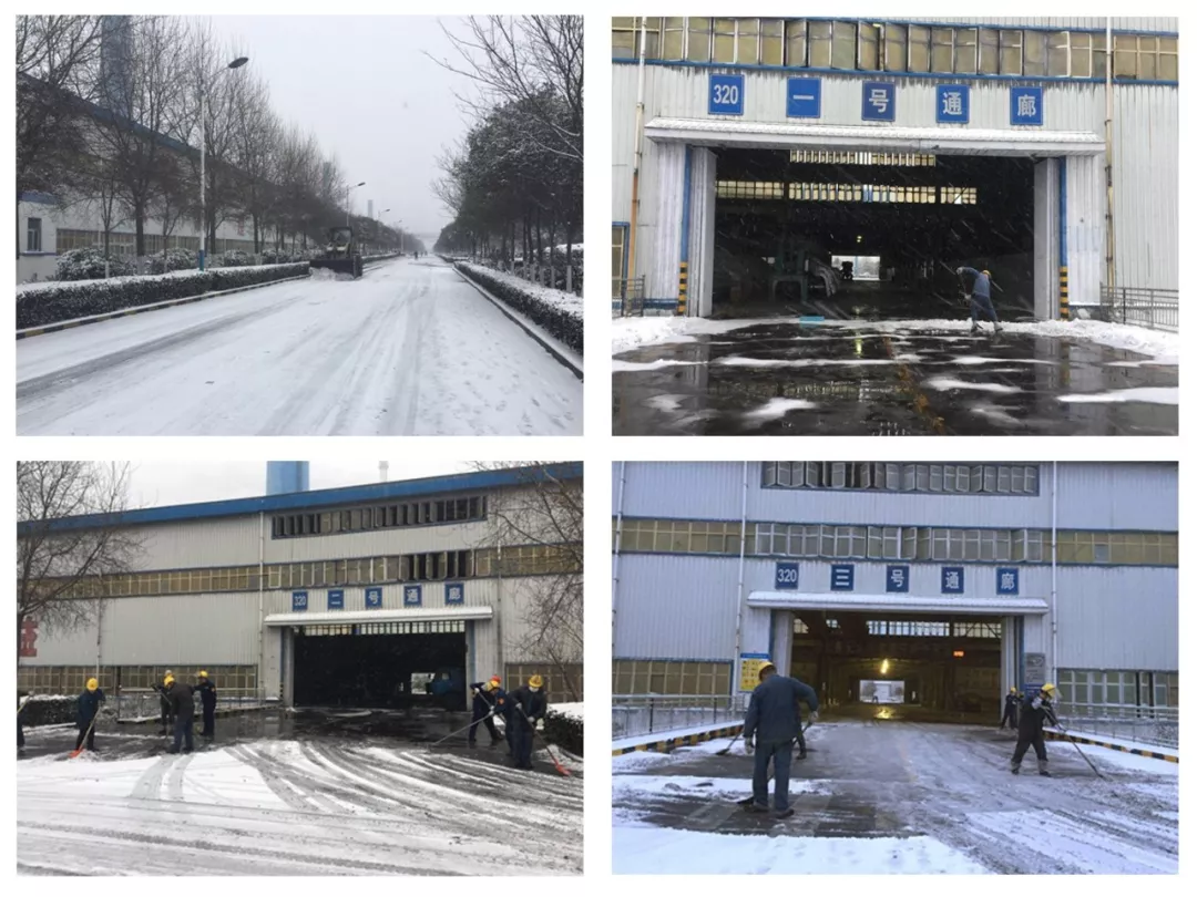 1月3日下午生產(chǎn)調(diào)度會上,銀湖鋁合金公司提前安排極端天氣應(yīng)對措施。1月4日一大早,公司干部員工不顧雪花紛紛、寒氣陣陣,揮舞著鐵锨、掃帚,在鏟車的配合下,奮力清掃廣場及運(yùn)輸?shù)缆贩e雪,保證正常生產(chǎn)作業(yè)秩序。