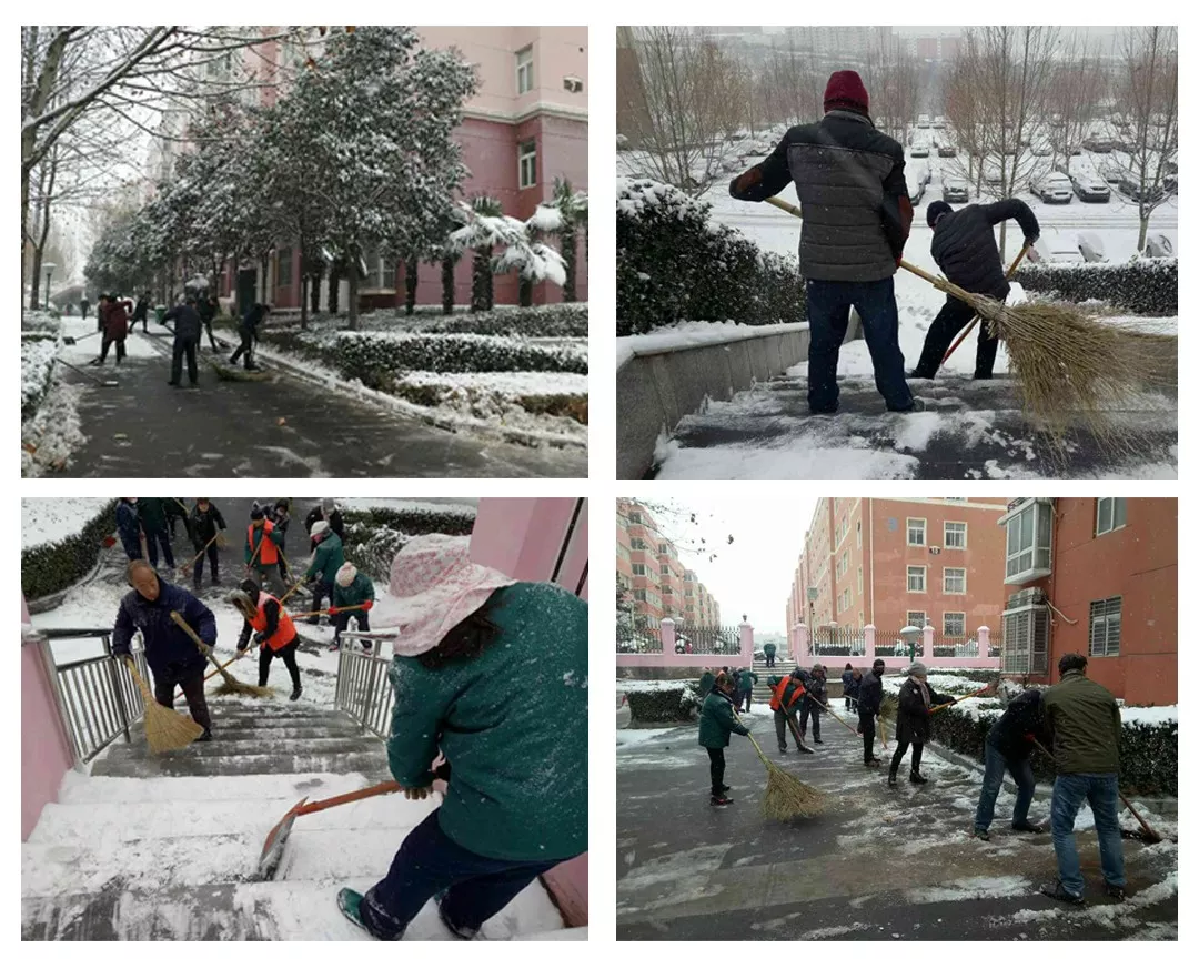 4日早上,園區(qū)物業(yè)公司全員出動,全力清掃積雪。由于雪一直不停地下,剛剛掃過的路面很快又被雪覆蓋,大家反復(fù)清掃,確保道路暢通。