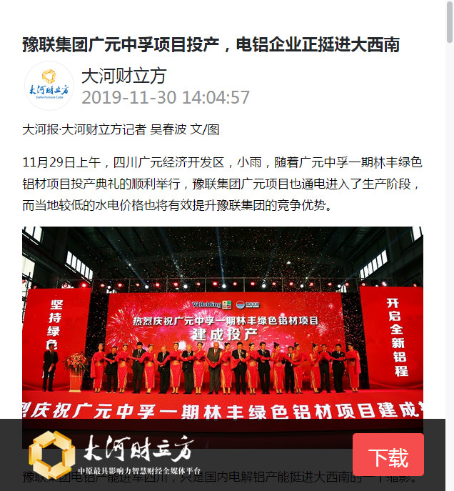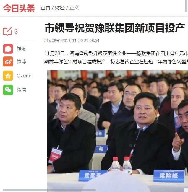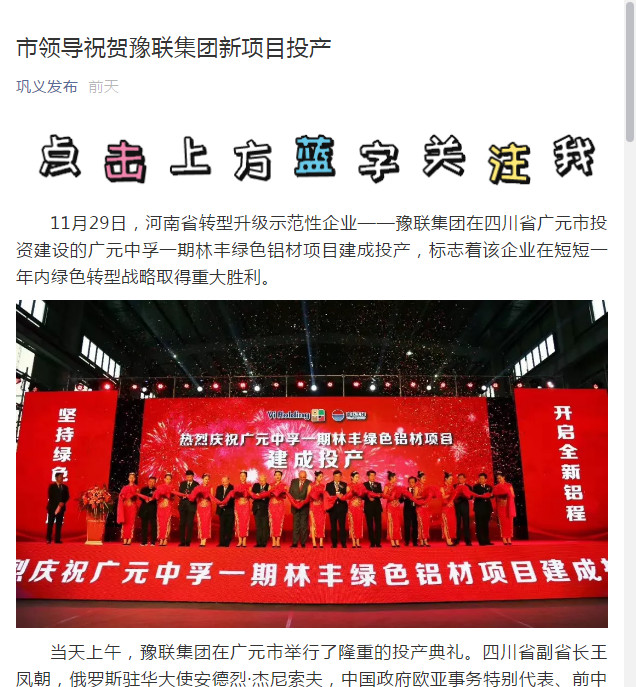 連日來,豫聯(lián)集團(tuán)廣元中孚一期林豐綠色鋁材項(xiàng)目建成投產(chǎn)的消息被中華人民共和國(guó)中央人民政府網(wǎng)、新華社、新華網(wǎng)、人民網(wǎng)、中國(guó)證券網(wǎng)、中國(guó)有色金屬報(bào)、河南日?qǐng)?bào)、鞏義市人民政府網(wǎng)等眾多主流媒體廣泛宣傳、轉(zhuǎn)載報(bào)道。